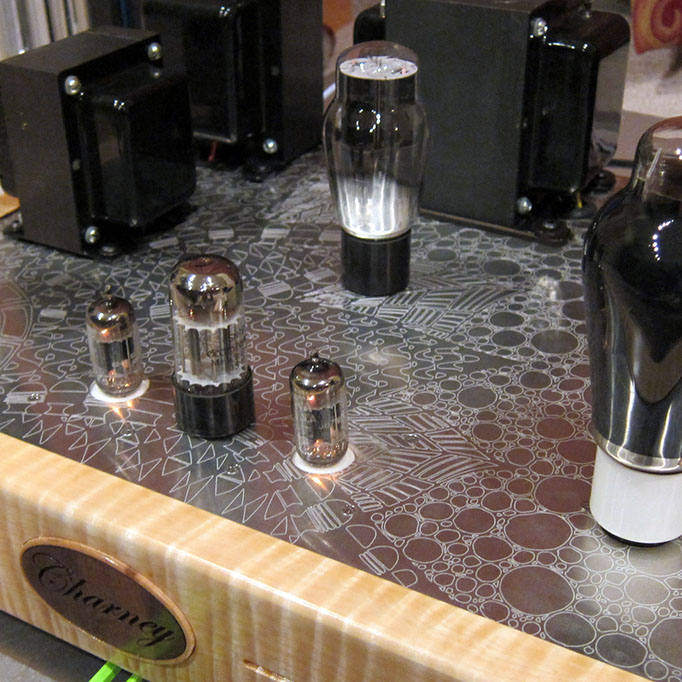 Our Integrated 300B Amplifier derives from an already excellent proven circuit. To start off we use some of the best output transformers in the business which in our opinion is the heart of an amplifier. On top are two directly heated 300B triode output tubes running in single ended class "A" without negative feedback. The 5U4G rectifier tube takes care of the power supply duties, two 5687 driver tubes and a 6SN7 input stage tube in front of the 300B. We use all high grade resistors and electrolytic capacitors in the circuit and signal paths. Point to point wiring is also used to once again achieve the best level of sound. All chassis can be custom made to your choice of hard woods and the top plate can also be designed to whatever you may have in mind. Manual volume control is standard with the option of a Remote.