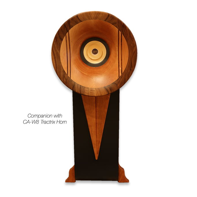 The Companion was developed to fulfill requests for a smaller version of The Concerto, without losing the Speed, Dynamics, and the Transparency that the beloved Voxativ drivers so beautifully presents. With that goal in mind, we've now achieved the sound of our flagship Concerto with a smaller cabinet and footprint, giving up only the very lowest bit of the bass, and still needing no sub woofer to satisfy completely, be it Hard Rock, or Soft Soloist. Using 6" and 8” drivers, with a horn measuring a full 108 inch long, the Companion will thrill you with clean, healthy bass down to 32H z and treble extension all the way up to 22kHz, with a sensitivity of 104 dB @ 8 Ohms.